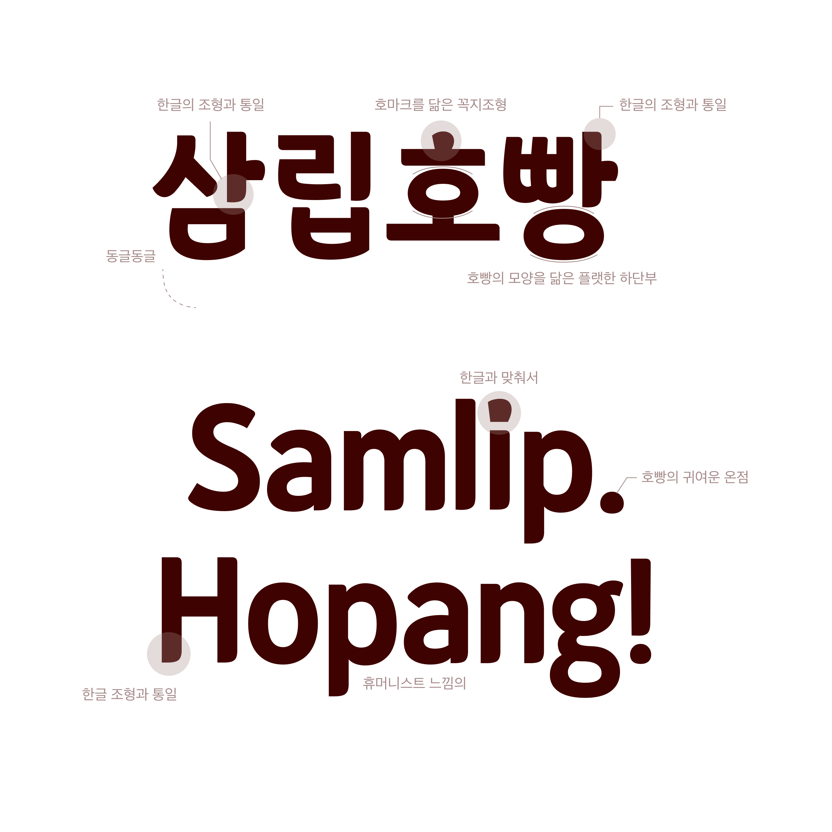 장체 구조의 젊고 캐주얼한 느낌을 가지면서 '호호~ 호빵'이 떠오르는 룩의 이 서체는, 삼립호빵의 기존 BI를 기반으로 호빵의 모습이 더 잘 연상되는 동글동글하고 통통한 느낌을 담은 자소 디자인을 추가하여, 삼립호빵 서체만의 개성이 드러나도록 해 주었습니다. 이러한 곡선적 자음들을 직선적 모음들이 잘 잡아주고, 서로 잘 어우러져 캐주얼한 룩을 줍니다.