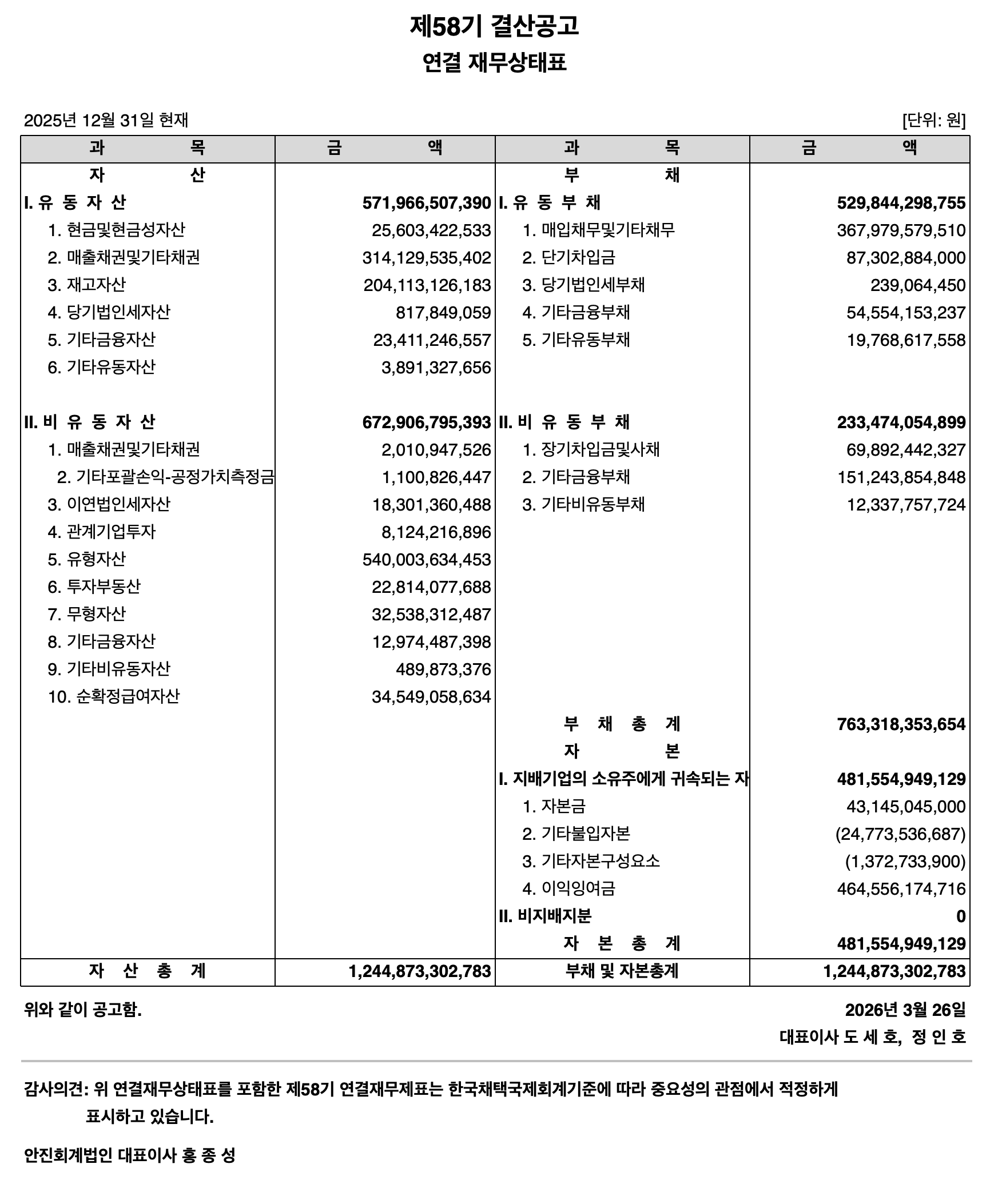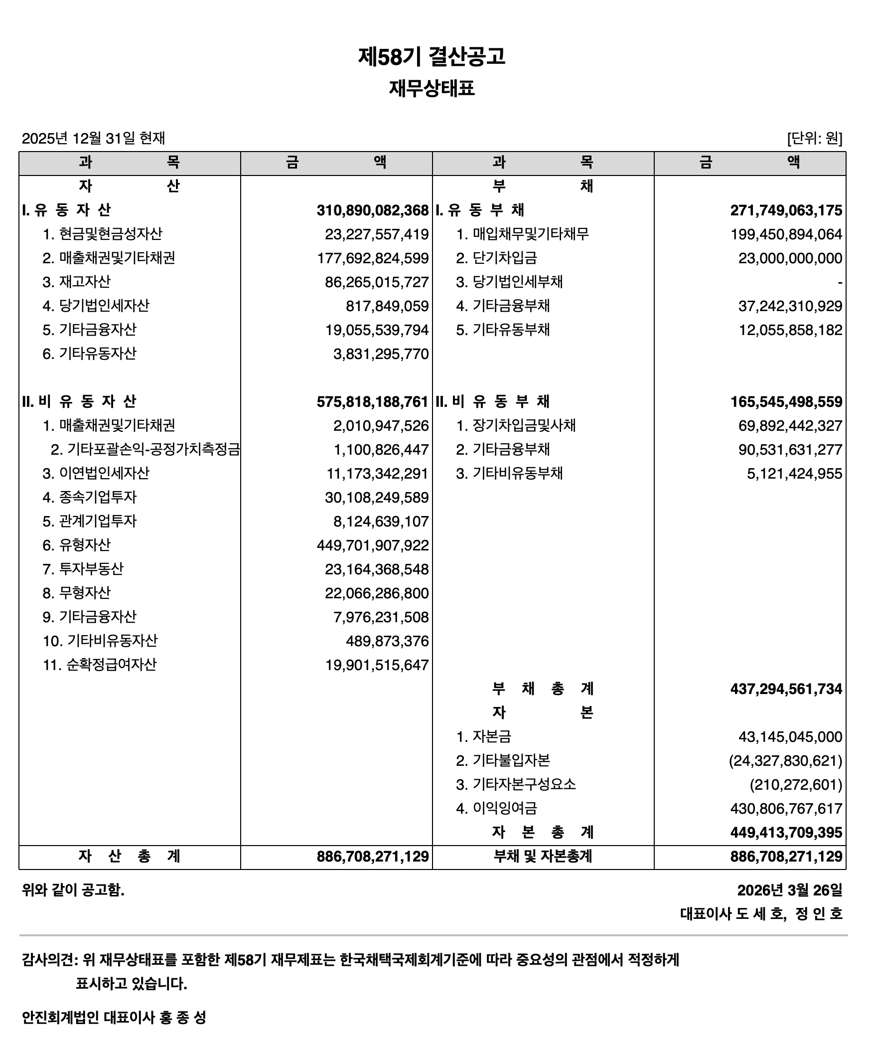 Home » 공고 » 제58기 결산공고 제58기 결산공고 2026년 03월 27일 다른 소식 제58기 결산배당 기준일 설정 공고 2026년 02월 24일 제57기 결산공고 2025년 03월 26일 구내매점 임대 입찰 재공고 2025년 01월 14일 구내매점 임대 입찰 공고 2024년 12월 23일 제56기 결산공고 2024년 03월 29일 제55기 결산공고 2023년 03월 24일 구내매점 임대 입찰 공고 2022년 12월 27일 구내매점 임대 입찰 공고 2022년 06월 15일 제54기 결산공고 2022년 03월 25일 제53기 결산공고 2021년 03월 26일 전체 목록 보기